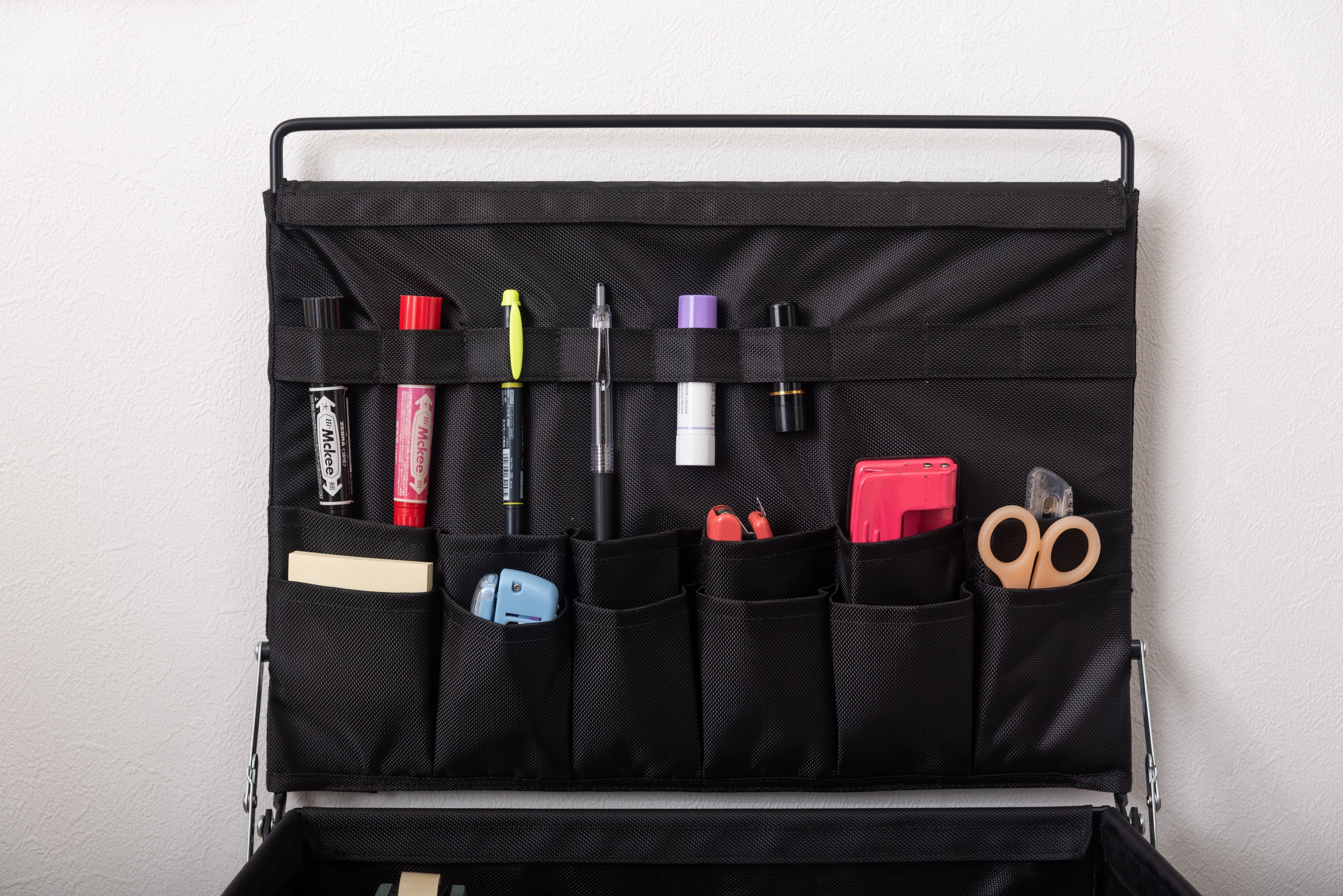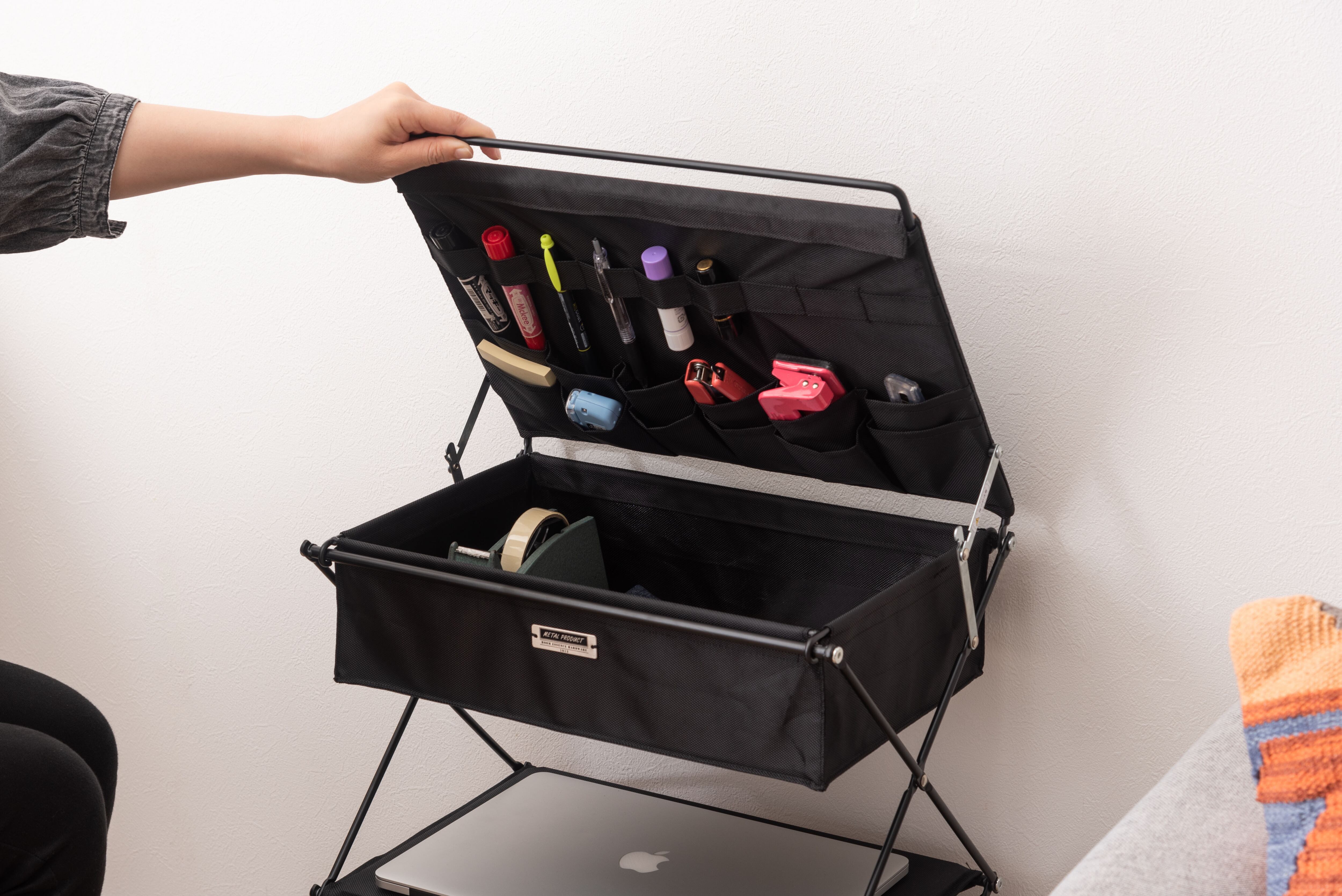 コンパクトに折り畳めるラックで、収納場所を取らずに使用できます。大きく開く蓋の裏には細々したものを効率よく収納でき、使用しないときは簡単に折り畳めるので持ち運びにも便利です。トップのボックス部分は取り外しもでき、個別に使用できます。